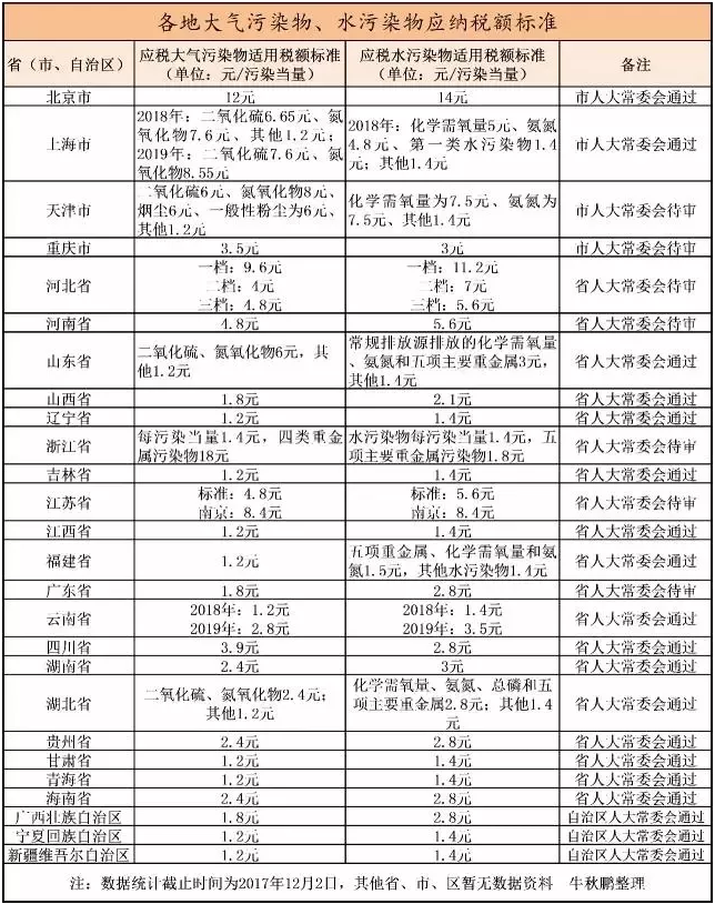 12月20日下午,安徽省十二届人大常委会第四十二次会议,表决通过了关于批准安徽省环境保护税应税大气污染物和水污染物适用税额标准的方案的决议。2018年1月1日起,安徽开始征收环境保护税,其中大气污染物税额标准为每当量1.2元,水污染物税额标准为每当量1.4元。今后视全省经济社会发展、环保形势变化或国家其他政策要求变化,再进行标准的调整。